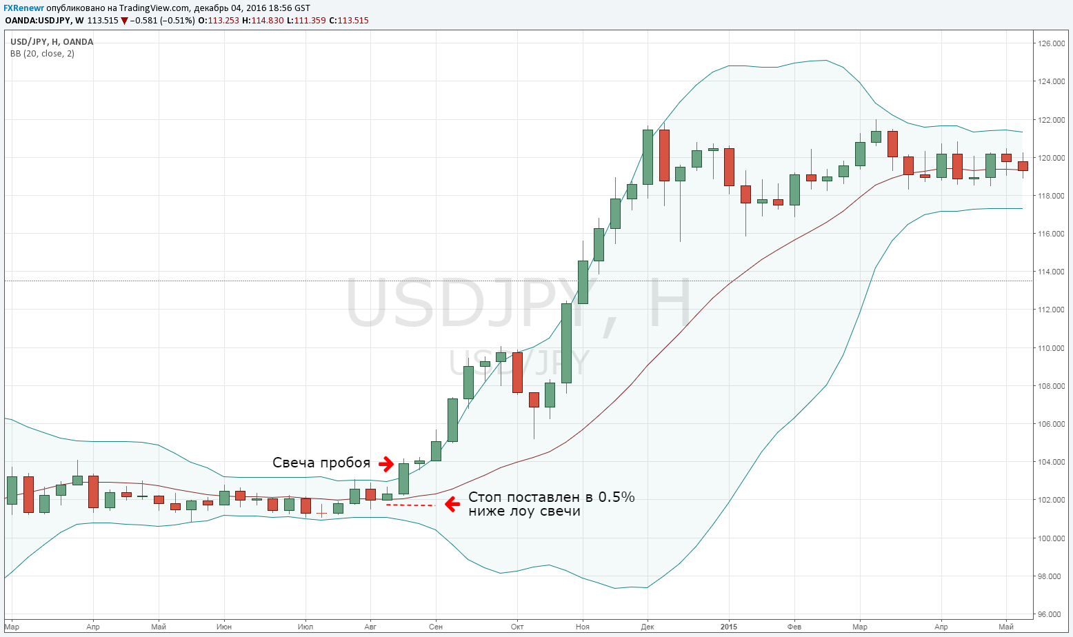 Подобно гепарду, преследующему свою жертву, поджидайте наилучший момент для входа, момент, дающий оптимальный профиль риск/профита. Отметьте точку пробоя (я использую недельные полосы Боллинджера) на графике. Затем спуститесь на дневной таймфрейм и ждите закрытия за отмеченной точкой. Это ваш триггер входа.
